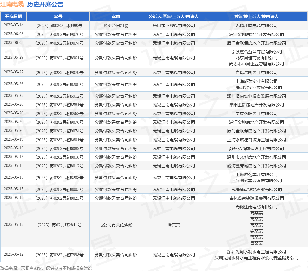案号:(2025)苏0282民初8023号审理法院:宜兴市人民法院案由:分期付款买卖合同纠纷当事人信息: 原告/上诉人:无锡江南电缆有限公司 被告/被上诉人:吉林省富锦建设集团有限公司开庭日期:2025年5月14日根据统计,近一年内以无锡江南电缆有限公司为当事人的历史开庭公告有138则,其中案由为“分期付款买卖合同纠纷”的公告以98则居首,其次为“买卖合同纠纷”有17则,“与公司有关的纠纷”有8则。历史开庭公告(前20条)如下: